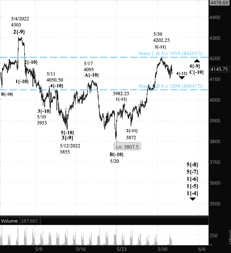A firm rule of Elliott wave analysis is that a 4th wave can’t move beyond the start of the preceding 1st wave. Wave 1{-9} began on April 21 from 4509. So wave 4{-9}, whether it turns out to be simple or complex, can’t move beyond that price.