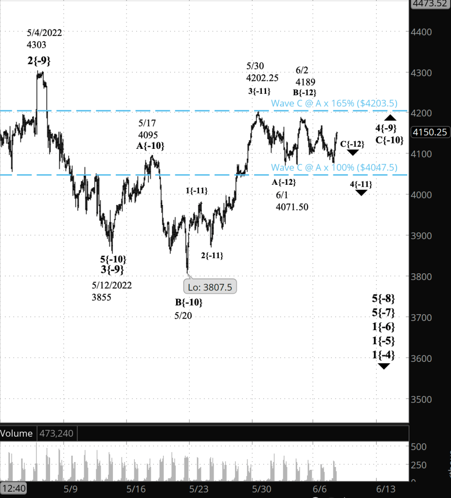 Half an hour before the closing bell. The S&P 500 declined during the session, reaching a low of 4076 on the futures, and then reversed upward. Wave C{-12} to the downside is still underway. The C wave can be expected to have five waves internally, whether the parent, wave 4{-11}, a downward correction, takes the form of a Flat or a Zigzag. So far wave C has completed three waves internally and today’s upward movement means that it is now in its 4th internal wave.