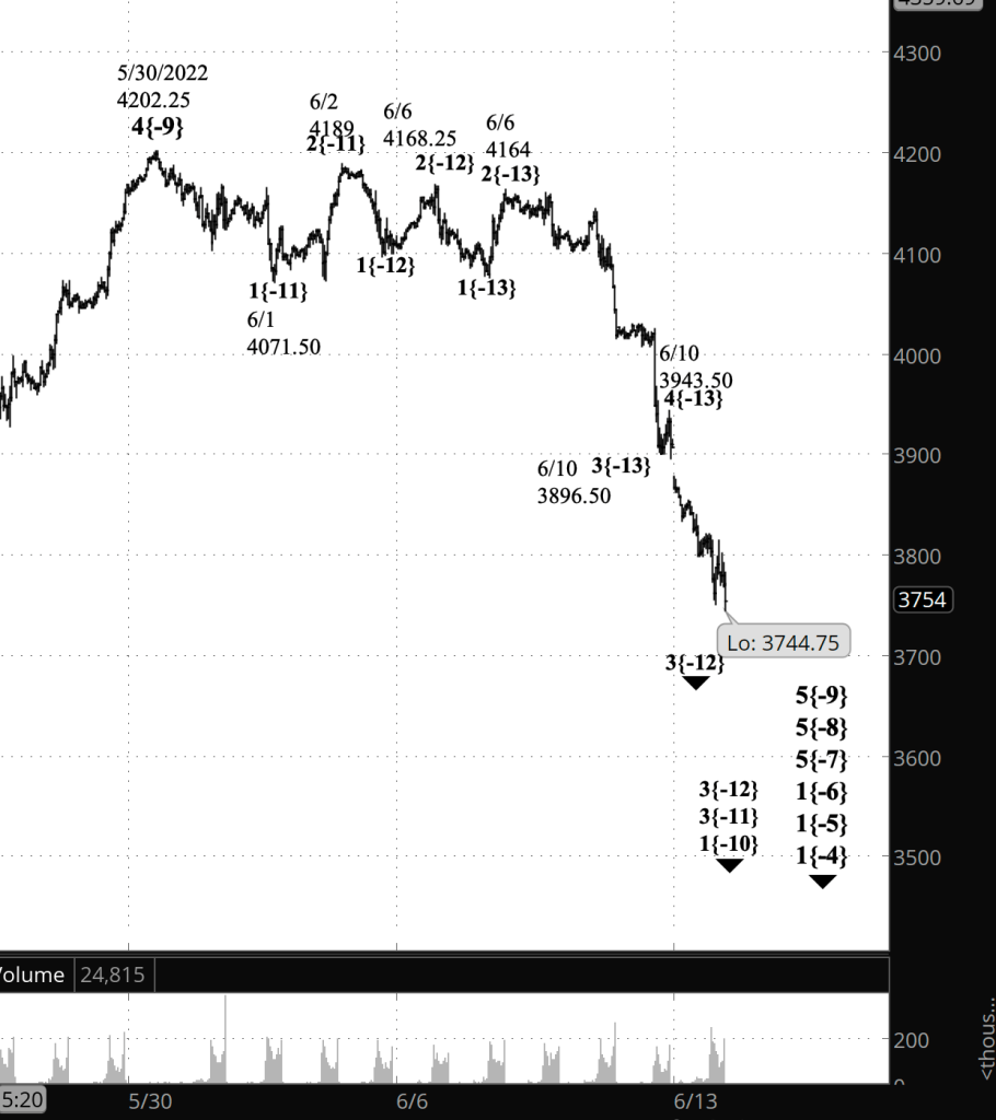 Within wave 4{-9}, wave 1{-10} is underway. The present decline, which began June 10 from 3943.50, is three levels smaller, wave 5{-13}, within wave 3{-12}, which began June 6 from 4861.25, within wave 3{-11}, which began June 2 from 4189.