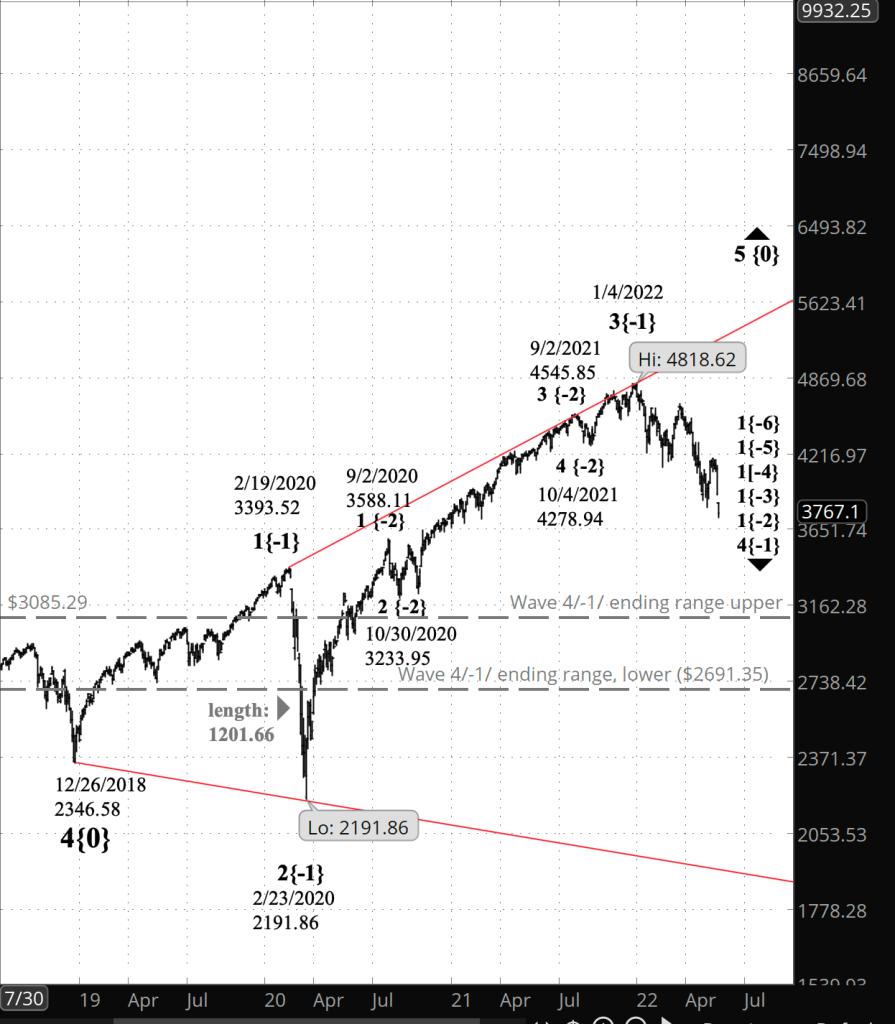 So, in Elliott wave terms, we’ve been in a bear market since January 4, and also since May 30, within a years-long bull market, wave 5{-0}, that is taking the form of an expanding Diagonal Triangle.