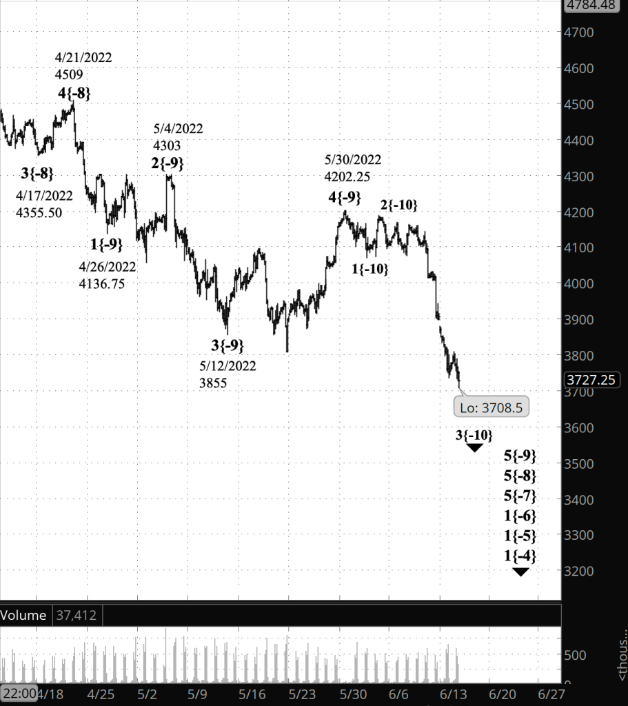 Since March 29 wave 5{-7} to the downside has been underway. It contains within it three 5th waves that are underway: Wave 5{-8} began on April 21, and wave 5{-9}, on May 30 from 4202.25. When wave 5{-9} is complete, it will also be the end of 5{-8}, 5{-7} and the parent wave one degree higher, wave 1{-6}, which began on January 4.