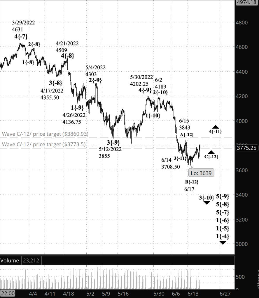 Half an hour before the closing bell. The S&P 500 has risen during the session, returning to the upper 3700s on the futures. The rise can be counted as wave 5{-13}, the final wave within wave C{-12}, which in turn is the final wave within the wave 4{-11} upward correction, which began on June 14. I’ve updated the chart.