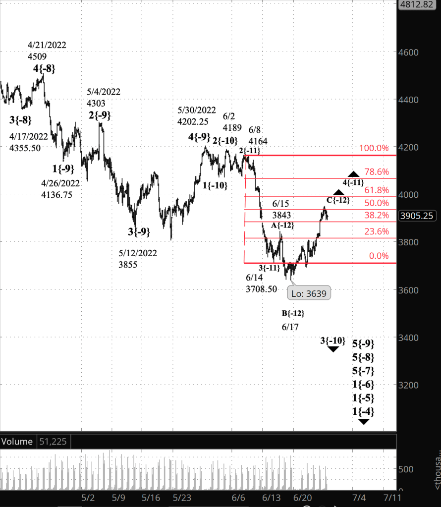 What does Elliott wave theory say? Wave 4{-11}, the upward correction that began on June 14 from 3708.50, has retraced 50% of the preceding decline, wave 3{-11}, which began on June 8 from 4164. The correction is tracing a Flat pattern, which is in its 3rd wave — wave C{-12}. Corrections tend to end close to Fibonacci retracement levels. A 50% retracement (3636.25) is one of the Fibonacci levels. So are the 68.8% (3990) and 78.6% (4066.52) retracements.