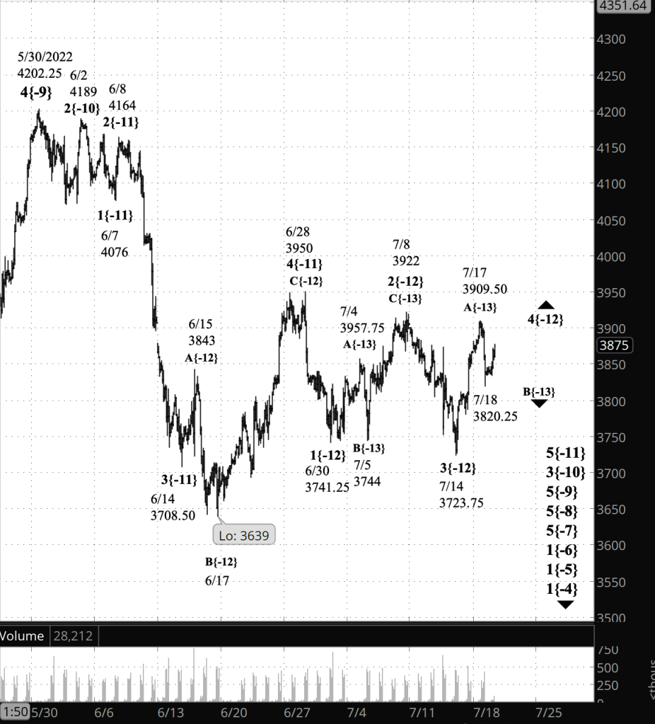 What does Elliott wave theory say? Both the principal analysis and the alternative analysis agree that wave 4{-12}, an upward correction that began on July 14 from 3723.75, is still underway. The question is what form that 4th wave is taking: A Flat, which would be most common for a 4th wave, or a Zigzag, which is more common for 2nd waves but not unheard of for 4th waves.