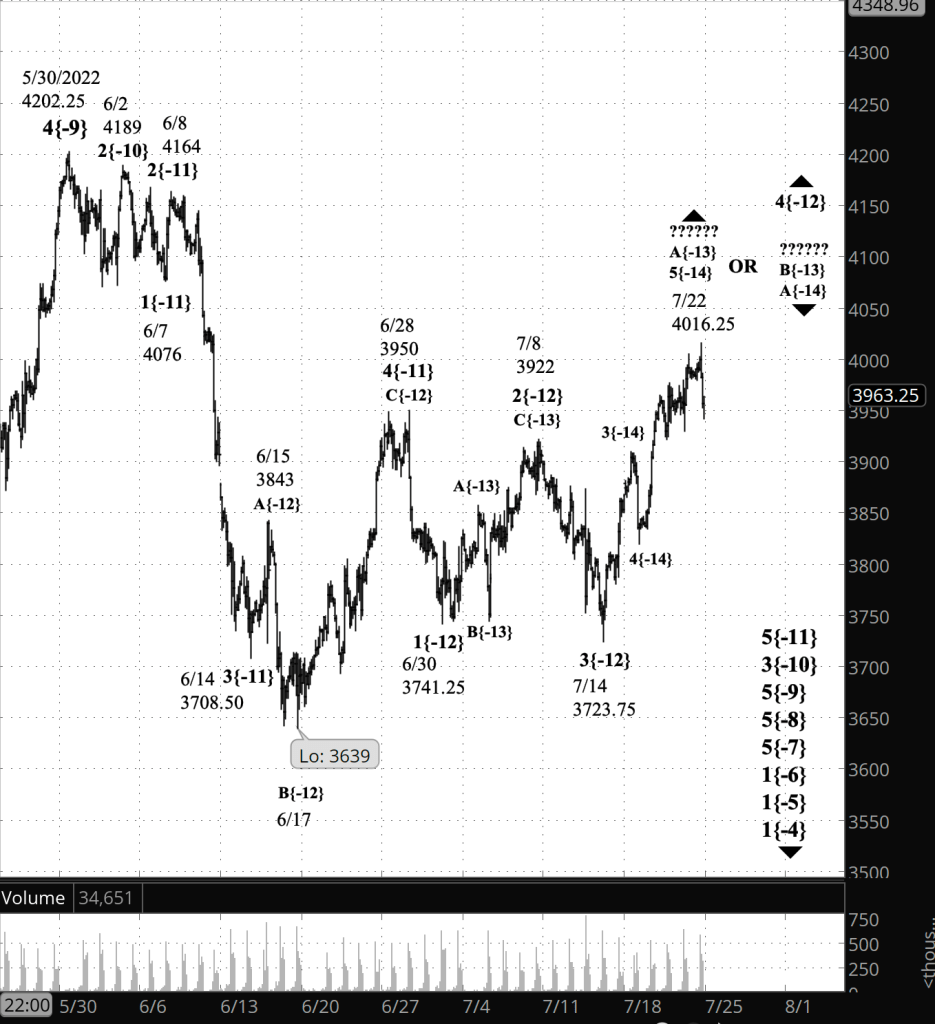 What does Elliott wave theory say? On the chart, I’ve placed the notations for both possible scenarios, each with a line of question marks at the top to flag the ambiguities. Within the upward correction, wave 4{-12}, either wave A{-13} is still underway, with further upside ahead beyond the high so far today, 4009, or wave B{-13} began at the peak high and is now descending.