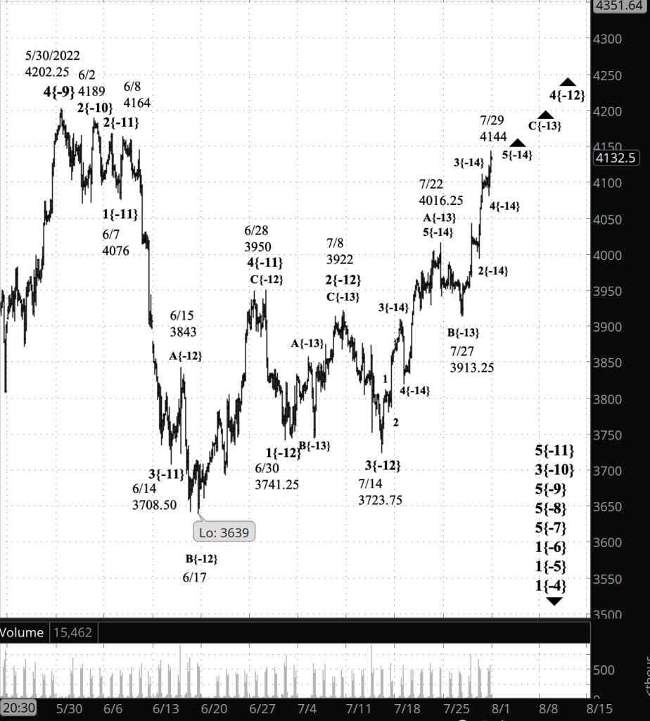 In Elliott wave terminology: Within wave C{-13}, yesterday’s high ended wave 3{-14}, the downward retracement was wave 4{-14}, and the subsequent rise in today’s session is wave 5{-14}, the final wave within the C wave. This is all happening with wave 4{-12}, the upward correction that began on July 14.