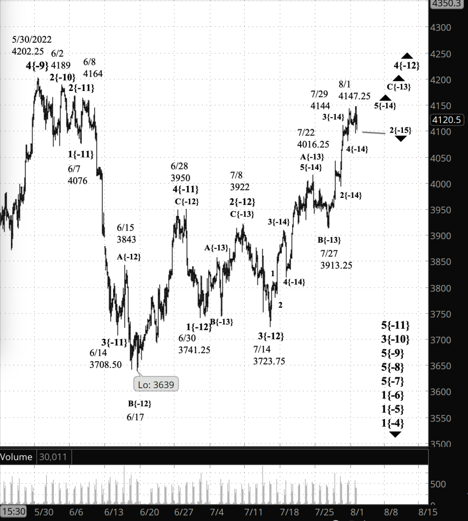 Half an hour before the closing bell. The S&P 500 moved slightly higher during the session, to 4147.25 on the futures, but has generally remained below that level.in the 4130s and 4120s. The higher high adds backing to this morning’s principal analysis: The upward correction that began on July 14 is still underway. In Elliott wave terminology: Wave 4{-12} is still underway, and internally it is nearing the end of the final wave, C{-13} of a corrective pattern.
