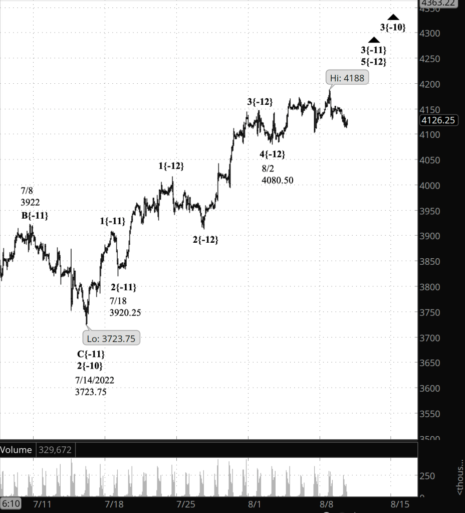 What does Elliott wave theory say? The rise from July 14 is wave 3{-10}. Internally, it is in wave 3{-11}, which began on July 18 from 3920.25, which in turn is in wave 5{-12}, which began on August 2 from 4080.50.