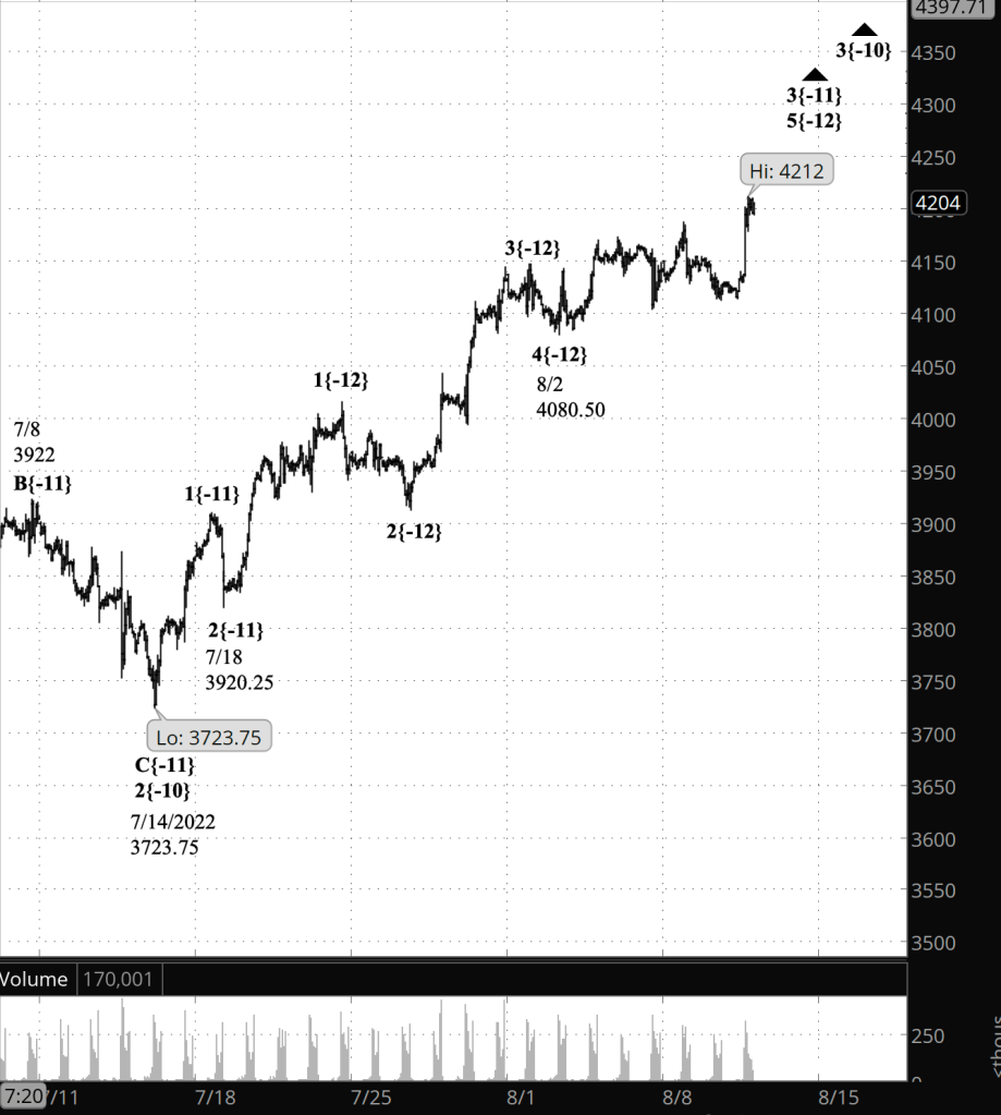 What does Elliott wave theory say? Uptrending wave 3{-10}, which began on July 14 from 3723.75, continues its rise, reaching a high before the opening bell that was 477.75 points above the wave’s starting point.