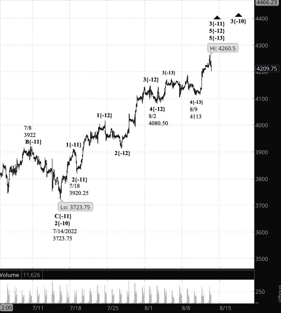 What does Elliott wave theory say? The uptrend that began on July 14 is wave 3{-10}, the middle wave within wave 1{-9}, which began on June 17 from 4202.25. Working from larger to smaller degrees, here is an inventory of the present wave line-up: Wave 3{-11} began on July 18 from 3920.25; within it, wave 5{-12} began on August 2 from 4080.25; and, still smaller, wave 5{-13} began on August 9 from 4113.
