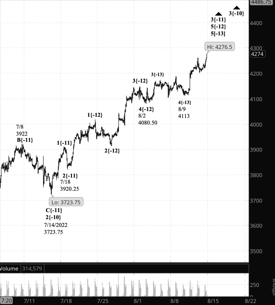 In Elliott wave terminology, the present wave set is wave 5{-14} within wave 5{-13} within wave 5{-12} within wave 3{-11} within wave 3{-10}, that last, largest wave of the set having begun on July 14.