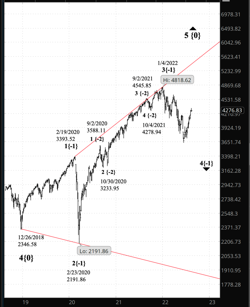 If we focus nine degrees larger, we find the market of July and August is a small portion of wave 4{-1}, a major downtrend that began on January 4 from 4818.62, which is in turn the penultimate subwave within wave 5{0}, an expanding Diagonal Triangle that is the final wave of an uptrend that began the day after Christmas, on December 26, 2018 from 2346.58 on the index, which reached a high, on August 16 at 4325.28.