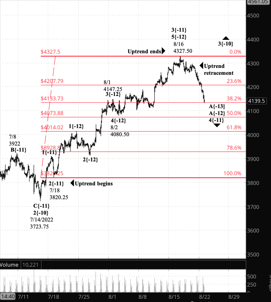 Half an hour before the closing bell. The S&P 500 E-mini futures having continued their decline during the session, reaching a low of 4133, a few cents below the 38.2% Fibonacci retracement level. The decline also put wave 4{-11} within the target range for a 4th wave, the range covered by wave 4{-12} in early August, within the preceding uptrend, wave 3{-11}, which ran from July 18 to August 16.