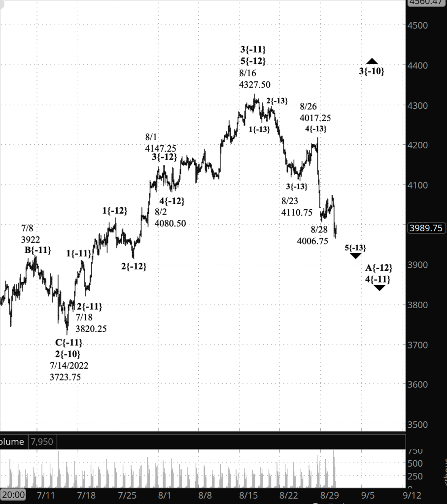 Half an hour before the closing bell. The rise overnight proved to be a bump within the sharp decline that began on August 26. In today’s session the price reached a low of 3964.50 on the futures. The first leg of the downward correction that began on August 16 — wave A{-12} within wave 4{-11} — is still underway. That first leg is in turn in its last segment, wave 5{-13}. I’ve added an afternoon the chart, retaining this morning’s chart for comparison