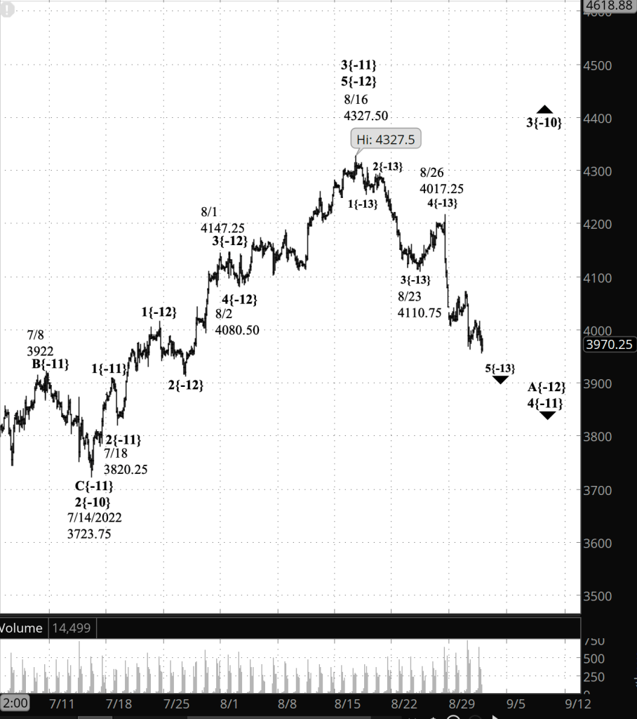 Half an hour before the closing bell. The S&P 500 continued to fall during the session, reaching beyond the overnight low down to 3956.50 on the futures. No change in the analysis. Downward wave 5{-13} with wave A{-12} within 4{-11} is still underway. I’ve updated the chart.