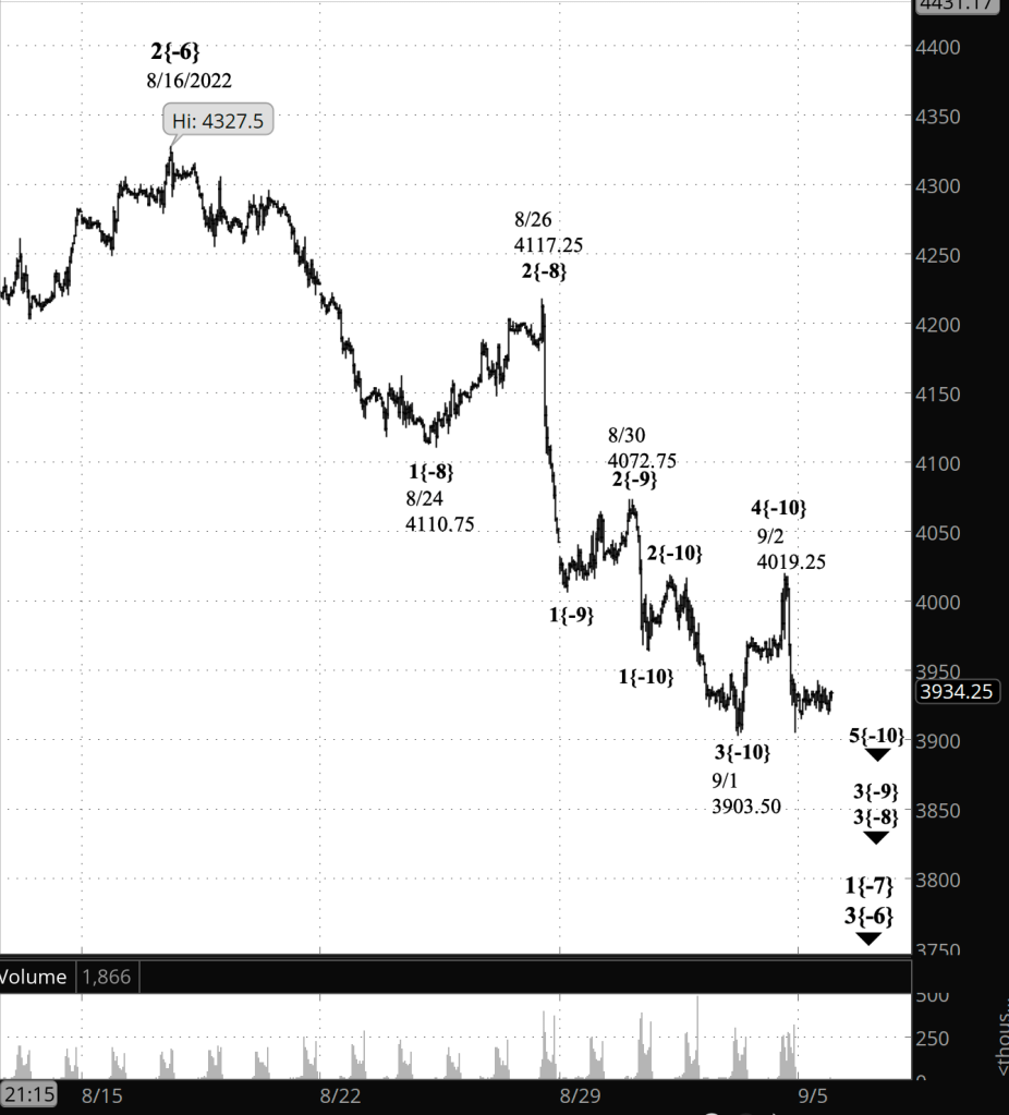 What’s happening now? The S&P 500 E-mini futures scribbled in a narrow range after trading resumed Sunday evening, fluctuating between 3915 and 3942. U.S. markets are closed today for the Labor Day holiday and will resume trading on Tuesday. This will be my only update today, unless the market breaks significantly out of that narrow range.