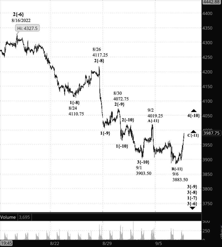 Switching to Elliott wave terminology, wave 4{-10}, an upward correction, began on September 1. Internally, its first wave, A{-11}, ended on September 2, its second wave, B{-11}, ended on September 6, and its 3rd wave, C{-11} is now underway.
