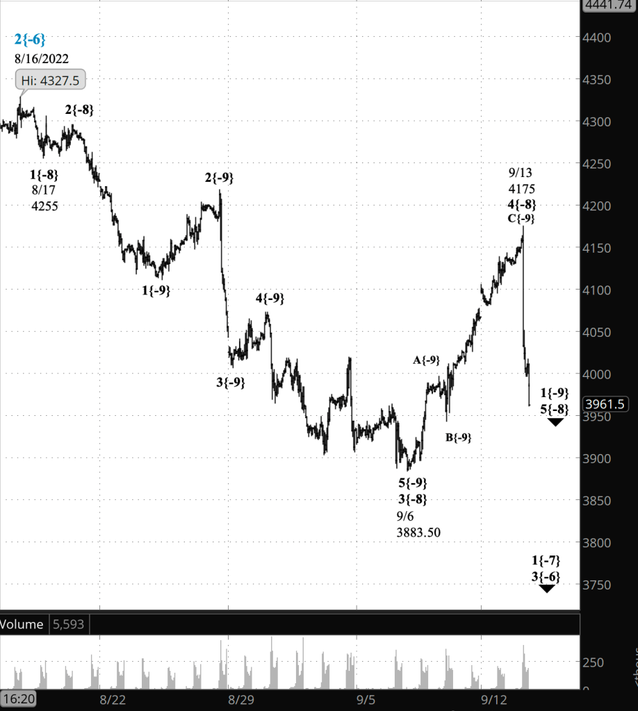 What does Elliott wave theory say? The overnight peak is the end of wave 4{-8}, an upward correction that began on September 6, and the beginning of wave 5{-8}, the final wave within wave 1{-7}, a downtrend that began on August 16 from 4327.50.