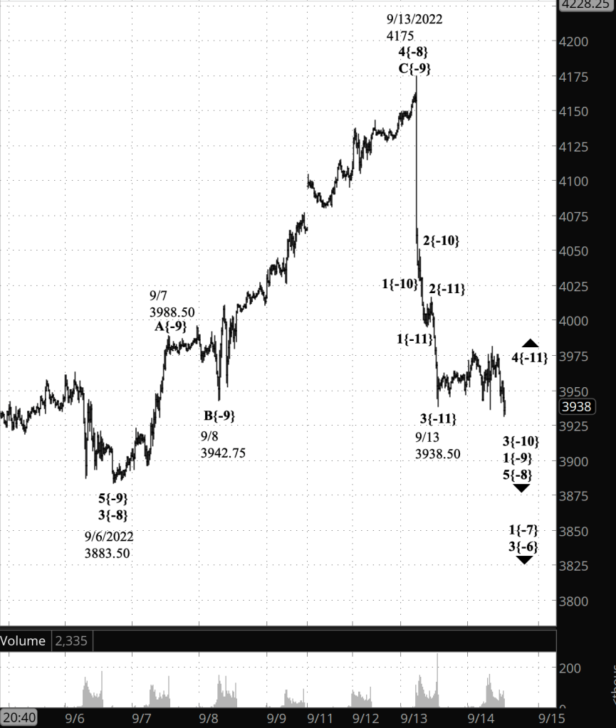 Under the alternative analysis, the September 13 peak was the end of wave A{-9}, the first subwave within wave 4{-8}, and the subsequent decline, now underway, is wave B{-9}. A reversal above 3883.50 and a clear rise toward the September 13 peak makes this alternative scenario more likely. Internally, wave B{-9} appears to be in its middle wave, B{-10}.
