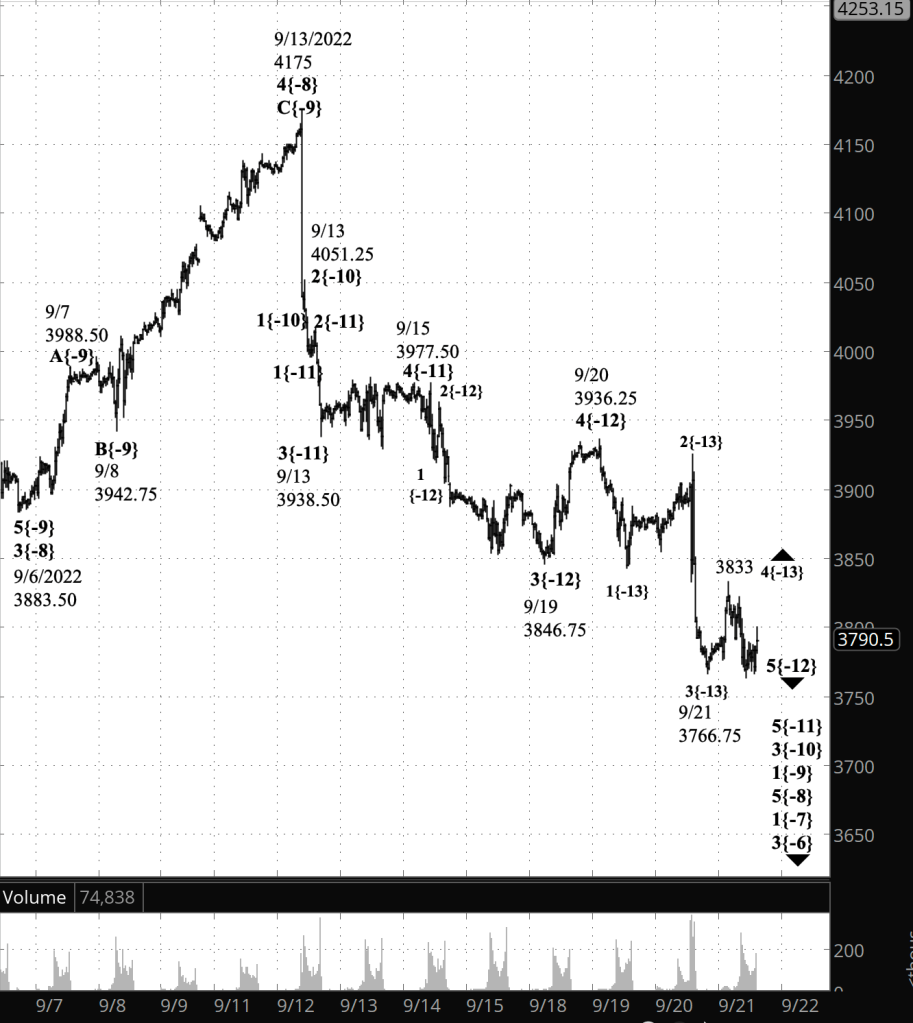 Under the principal analysis, wave 4{-13} will be followed by downtrending wave 5{-13}, the final wave within the parent wave 5{-12}. The end of wave 5{-13} will also be the end of wave 5{-12}, and will cascade up two nested waves of increasing size, wave 5{-11}, which began on September 15, and wave 3{-10}, which began on September 13 from 4051.25. An upward correction, wave 4{-10}, will ensue, likely carrying the price back up into the mid- and high-3900s.