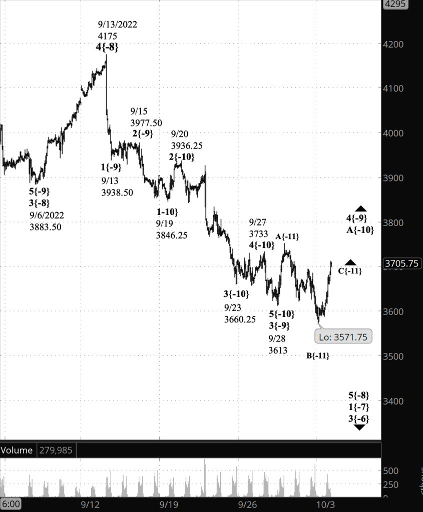 The overnight price fell below the start of wave 4{-9}, and although such a fall below the starting point isn’t done in 2nd waves, it happens routinely in 4th waves. A short rising wave C{-11} and then a large decline would, however, trigger the alternative count: Wave 4{-9} ended on September 28, at the peak of what is now labeled wave A{-11} on the principal analysis, and wave 5{-9} has begun.
