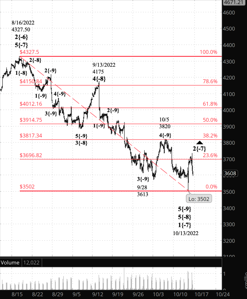 What does Elliott wave theory say? Under the principal analysis, wave 2{-7} began yesterday from 3502 and is retracing the preceding downtrend, wave 1{-7}, which began on August 16 from 4327.50. A 2nd wave never moves beyond the starting point of the preceding 1st wave, which was 4327.50 for wave 1{-7}. That price is a firm limit for wave 2{-7}.