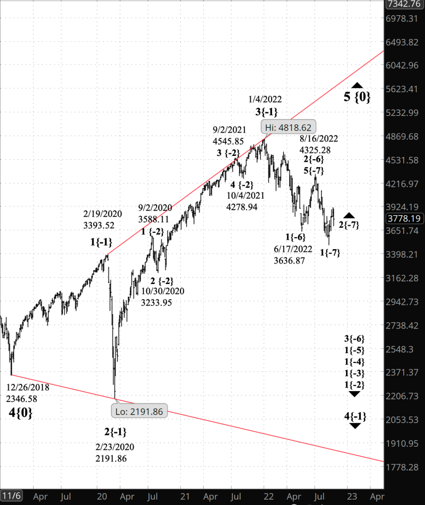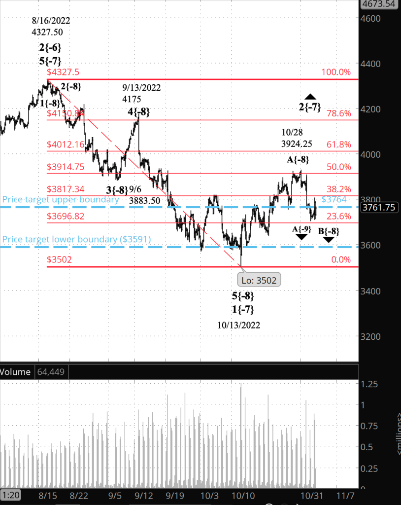 What does Elliott wave theory say? An upward correction, wave 2{-7}, that began on October 13 from 3502 is underway, and the middle wave of the corrective pattern, wave B{-8}, is nearing its end. Wave B{-8} has remained within the likely range of its terminus, 3591 to 3764, since October 3. The B wave will be followed by rising wave C{-8}, the final wave of the corrective pattern, which will likely rise into the 4000s.