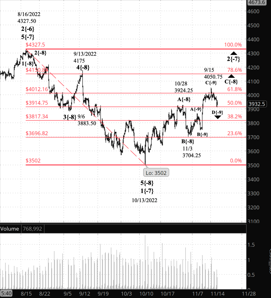 The C wave with within a Zigzag is often about the same length as the A wave. The length of wave A{-8} was 422.25. Wave C{-8} began at 3704.25. So the Wave C{-8} endpoint typically would be around 4126.50, about 127 points above Monday’s high, 4050.75, almost reaching the 78.6% Fibonacci retracement level.