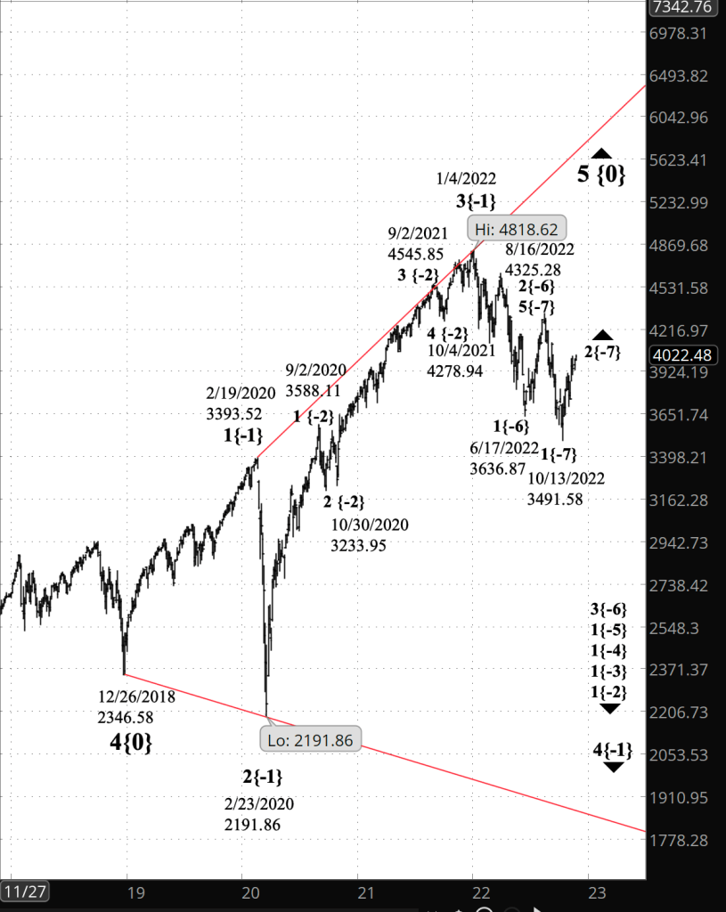 The two corollaries have to do with the nature of the decline that follows the 4049.25 peak. Corollary #1 sees it as the beginning of wave 3{-7}, a powerful downtrend. Corollary #2 sees it as a wave connecting two corrective patterns within the ongoing wave 2{-7} upward correction. The present decline is wave X{-8}, and it will be followed by a second corrective pattern, beginning with rising wave A{-8}.