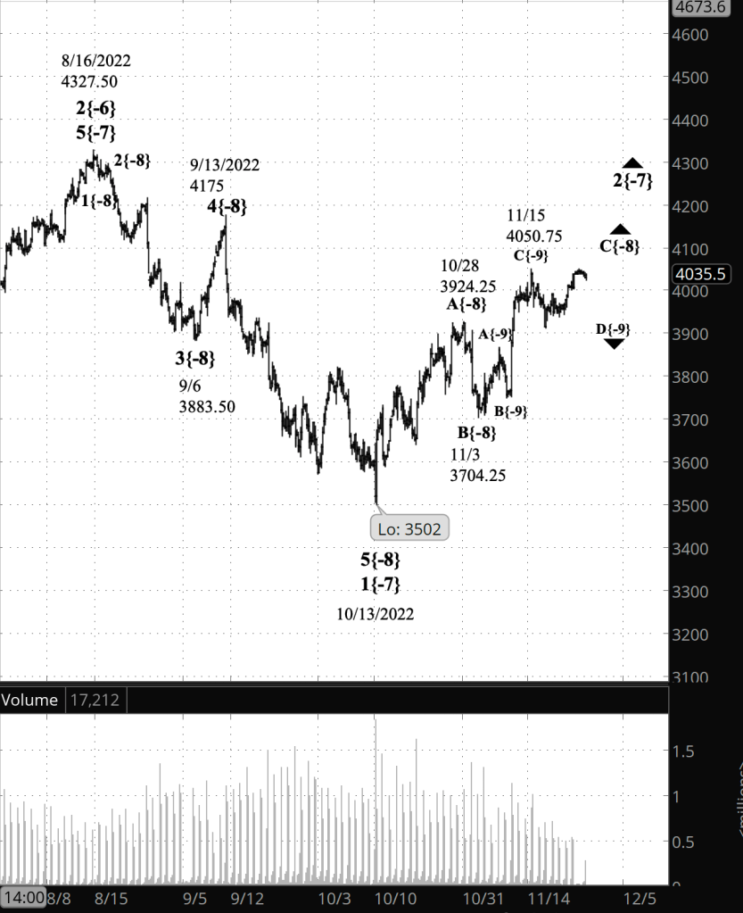What’s happening now? The S&P 500 E-mini futures declined in overnight trading, reaching into the 4030s as the opening bell approached. The price remained below the high so far, 4049.25, reached on November 15 by the upward correction that began on October 13.