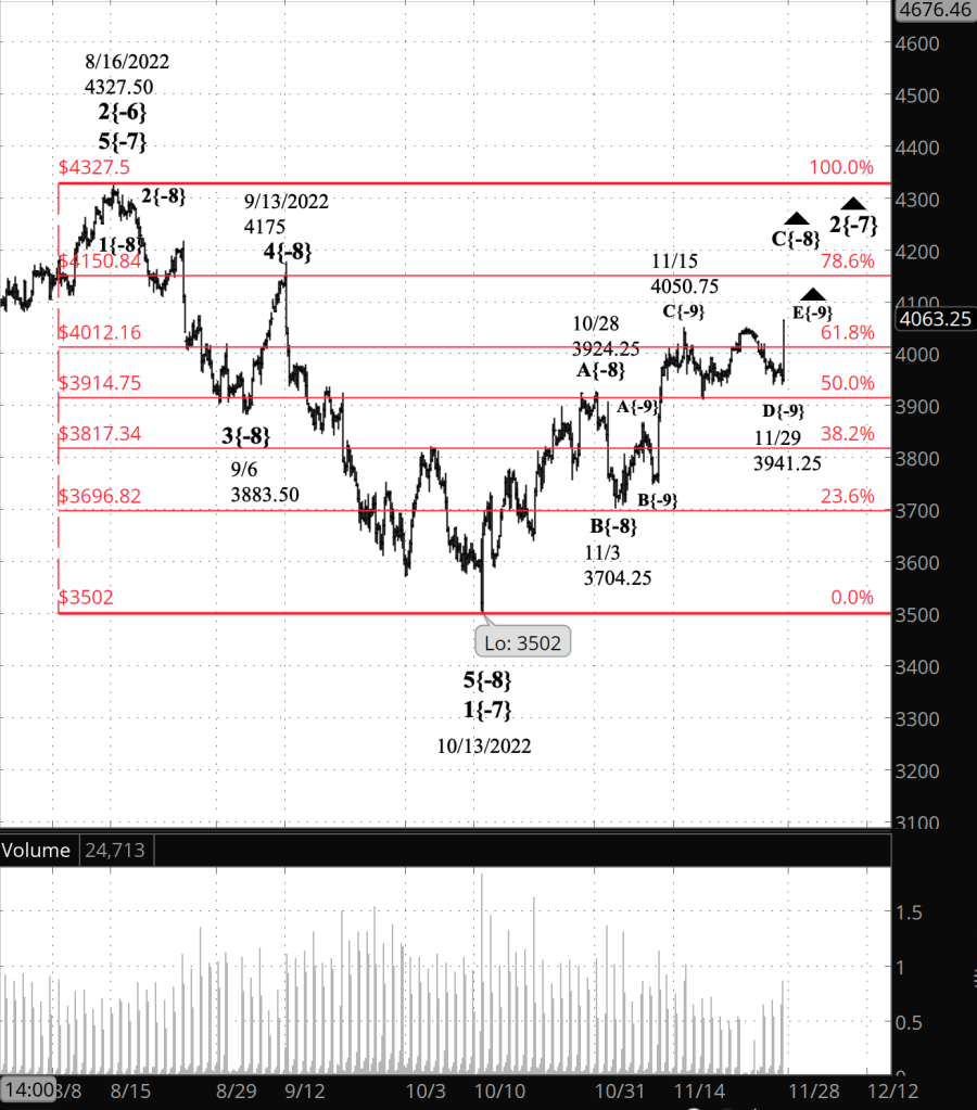 The alternative shows wave 2{-7} as having ended at the recent high, 4050.75.