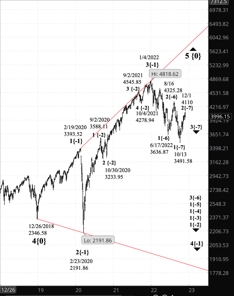 - If wave 2{-7} ended on December 1, then declining wave 3{-7} is underway, a powerful downtrend that is the middle wave within a larger powerful downtrend, wave 3{-6}, which began on August 16.