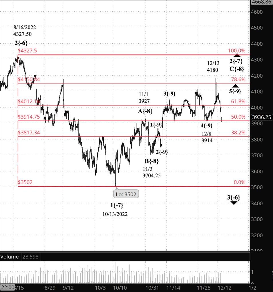 Half an hour before the closing bell. The S&P 500 futures has continued to decline during the session, reaching 3908 in a fall that began from 4180. The lower the price falls, the more likely it is that the upward correction that began on October 13 ended on December 13. For now, I’ll continue to mark the chart as though the correction, wave 2{-7}, is still underway. I think it’s just as likely that the correction has ended and a significant downtrend, wave 3{-7}, has begun. I’ve updated the chart.