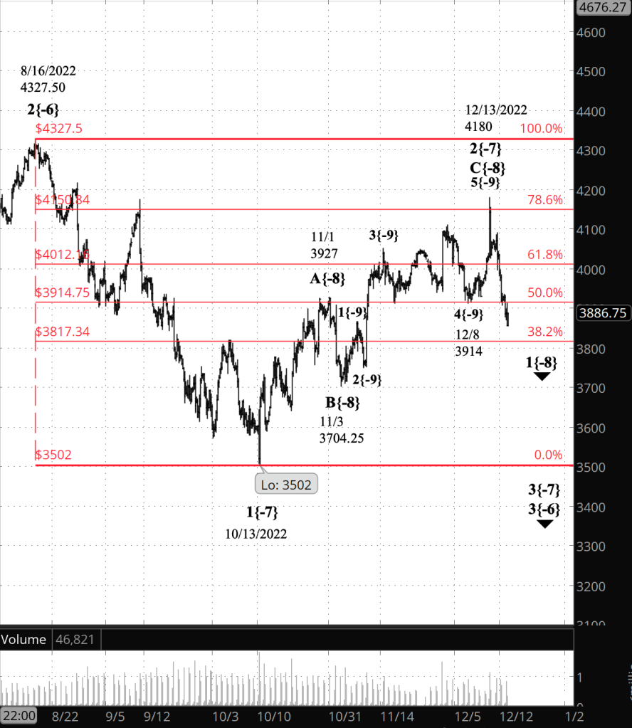 What’s happening now? The S&P 500 E-mini futures continued to fall in overnight trading. The price is now closer to the starting point of the upward correction that began on October 13, from 3502, than it is to the correction’s December 13 peak, 4180,