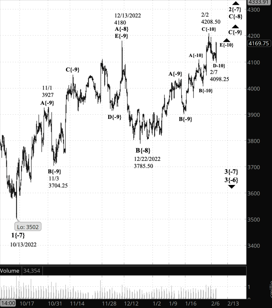 What does it mean? The futures continue to trace out an upward correction that began on October 13, 2022. The final leg of the correction began on December 22, 2022. That final leg is in turn in its next-to-the-last segment, a downward movement, which may well have ended with the February 6 low of 4104. If that segment has indeed ended, then the rising, final segment of the final leg of the correction is now underway.