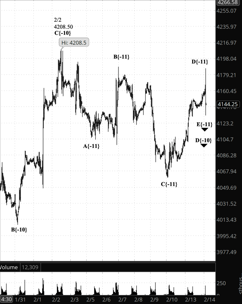 - A wave in wave E{-10}’s position normally will exceed the endpoint of the prior upward wave, 4208.50, which is wave C{-10}. That peak was attained on February 2.