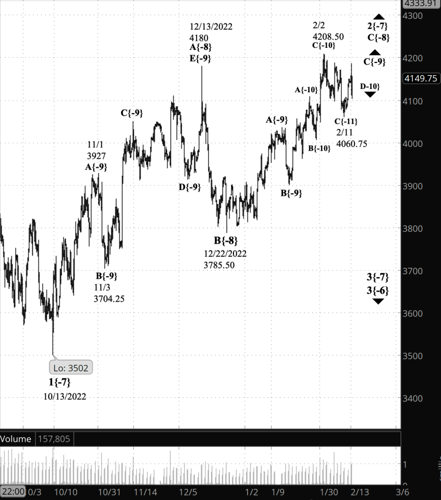 - … a breakout above 4208.50 — the end of rising wave C{-10} — confirms that wave E{-10} is underway,