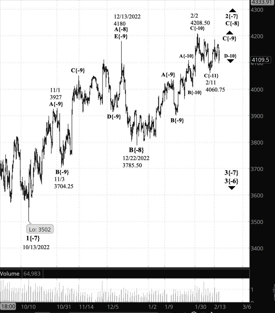 - A wave in wave E{-10}’s position normally will exceed the endpoint of the prior upward wave, 4208.50, which is wave C{-10}. That peak was attained on February 2.