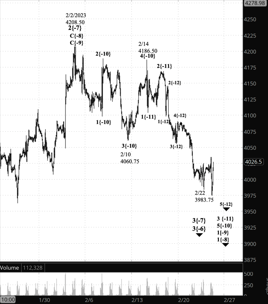 - A wave in wave E{-10}’s position normally will exceed the endpoint of the prior upward wave, 4208.50, which is wave C{-10}. That peak was attained on February 2.