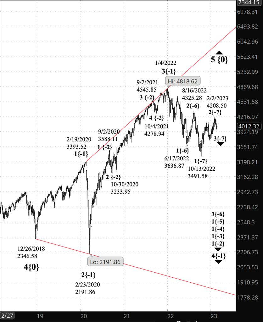 - Wave 3{-7} is still taking its tentative first steps and will develop into a powerful downtrend that will carry the price below 3502, the starting point of the preceding upward correction, wave 2{-7}, and most likely significantly below that level.
