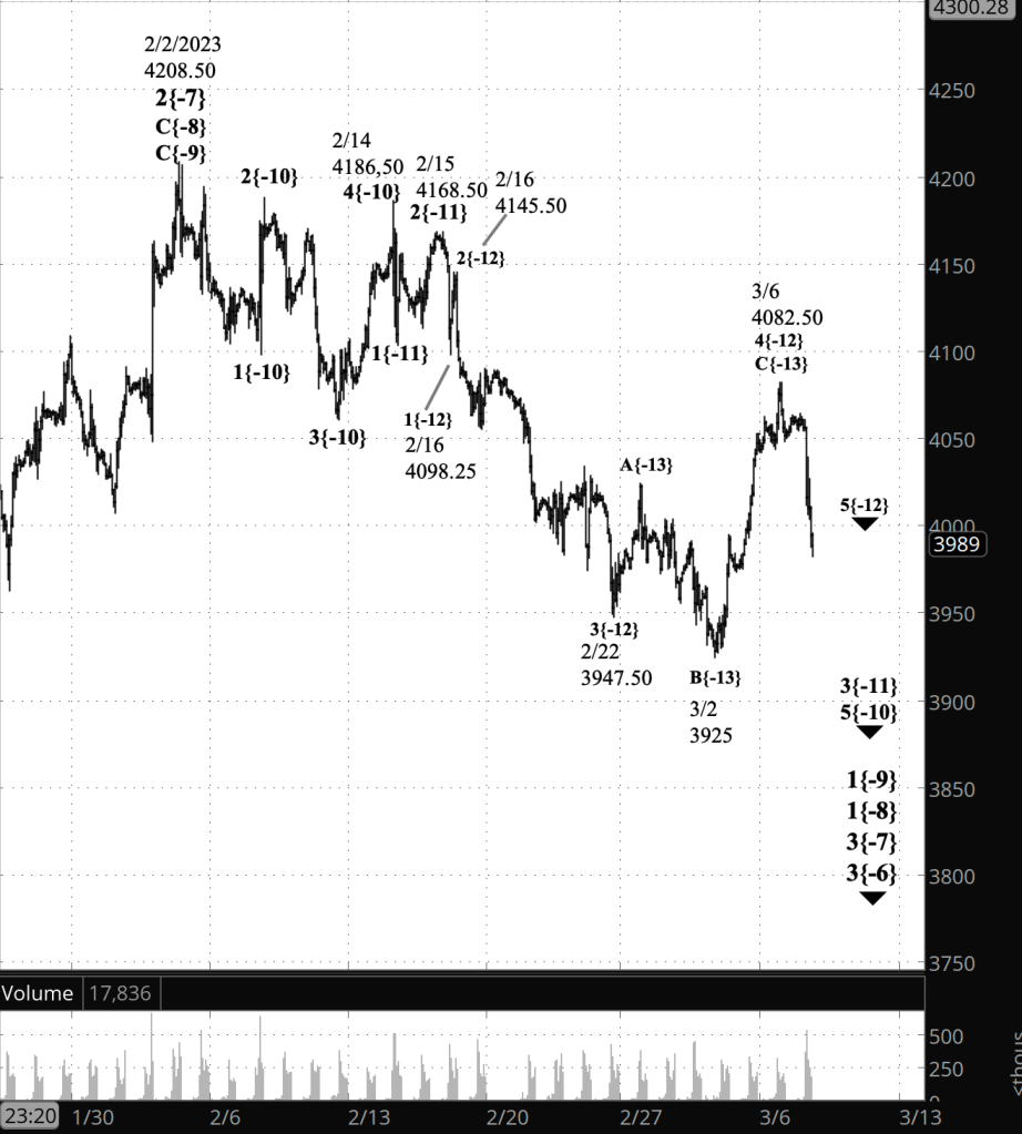 Half an hour before the closing bell. The S&P 500, index and futures, continued to fall during the session, with the futures reaching into the 3980s. The power of the decline pretty much eliminates this morning’s alternative analysis. Downtrending wave 5{-12} is underway and, if typical, can be expected to reach below 3947.50, and perhaps significantly lower.