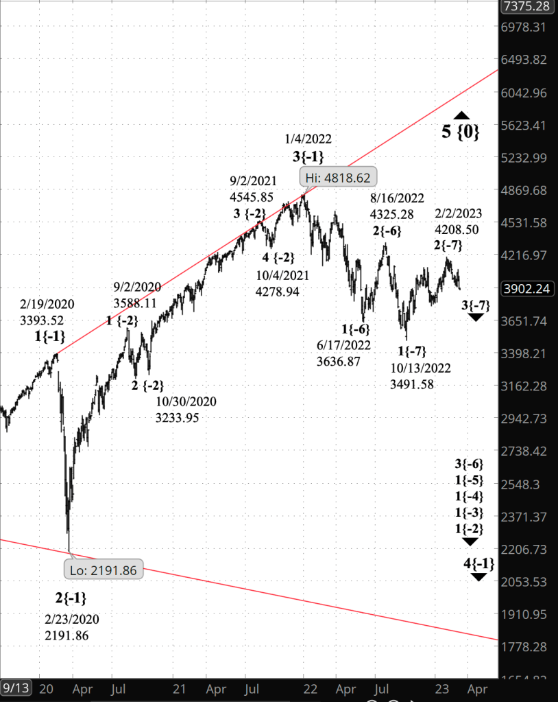- Wave 3{-7} is still taking its tentative first steps and will develop into a powerful downtrend that will carry the price below 3502, the starting point of the preceding upward correction, wave 2{-7}, and most likely significantly below that level.