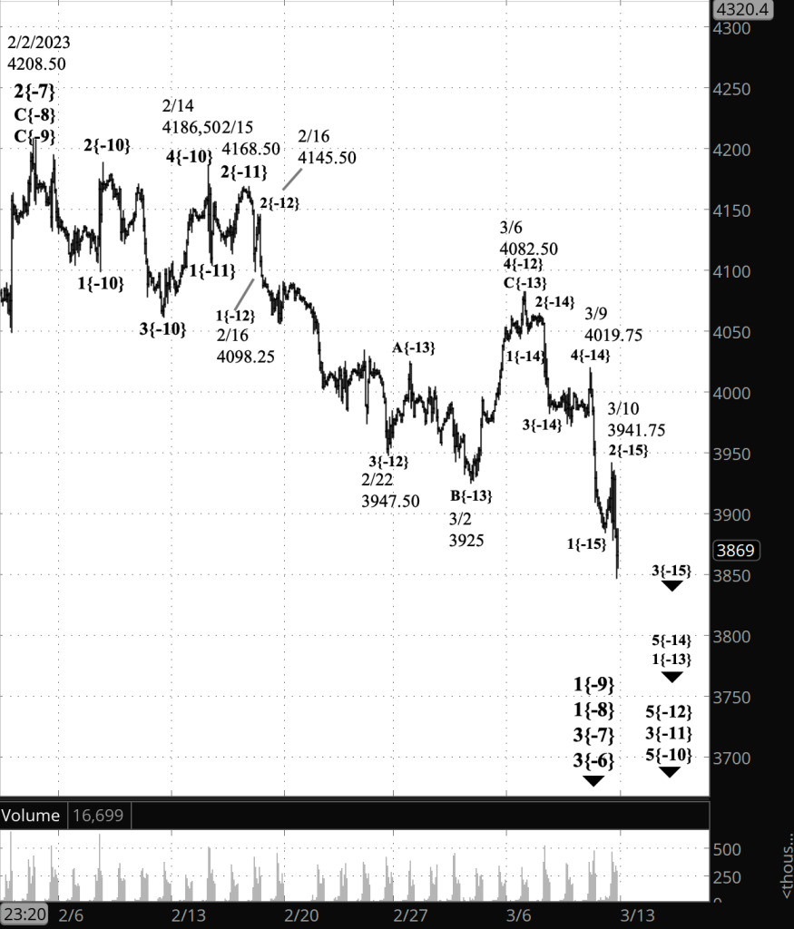 Half an hour before the closing bell. The S&P 500 futures moved below the overnight low, confirming that downtrend that began on March 6 is continuing. In Elliott wave terminology, the downtrend is wave 5{-12}. Internally, it is in its initial wave, 1{-13}, and that initial wave is in its final segment, wave 5{-14}. That final segment has a ways to go. Its downtrending middle segment, wave 3{-15}, began from today’s high, 3941.75 and so far has reached in to the 3840s.