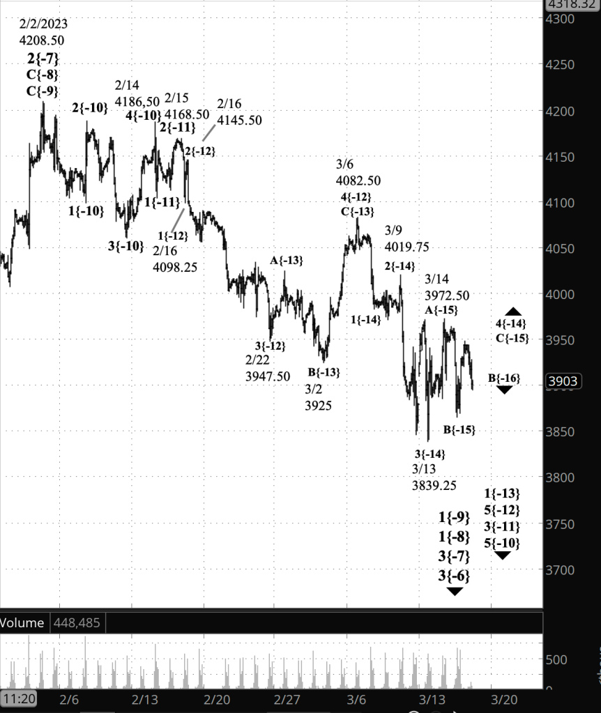 - Wave 4{-14}, an upward correction, ended on March 14 and downtrending wave 5{-15} is underway.