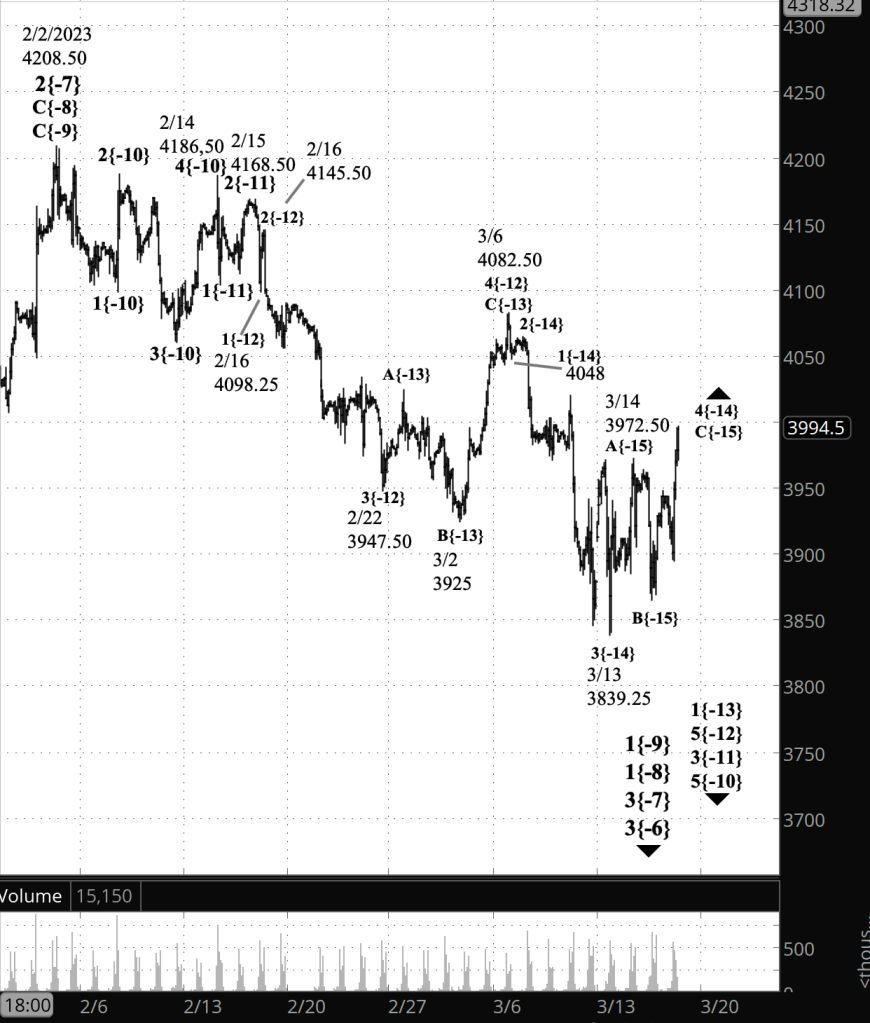 Half an hour before the closing bell. The S&P 500 futures rose during the session, sending the upward correction, wave 4{-14}, breaking above 3982.50, marked as the end of wave 1{-14} on this morning’s chart.