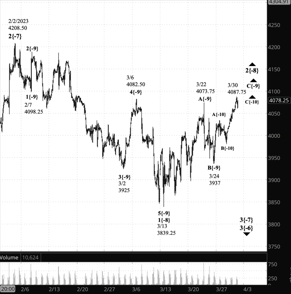 Half an hour before the closing bell. The S&P 500 futures peaked at 4087.75 early in the session and then fell back to the 4060s. It’s possible the peak marked the end of the 3rd of five waves within the final wave of the upward correction that began on March 13. Or perhaps not.