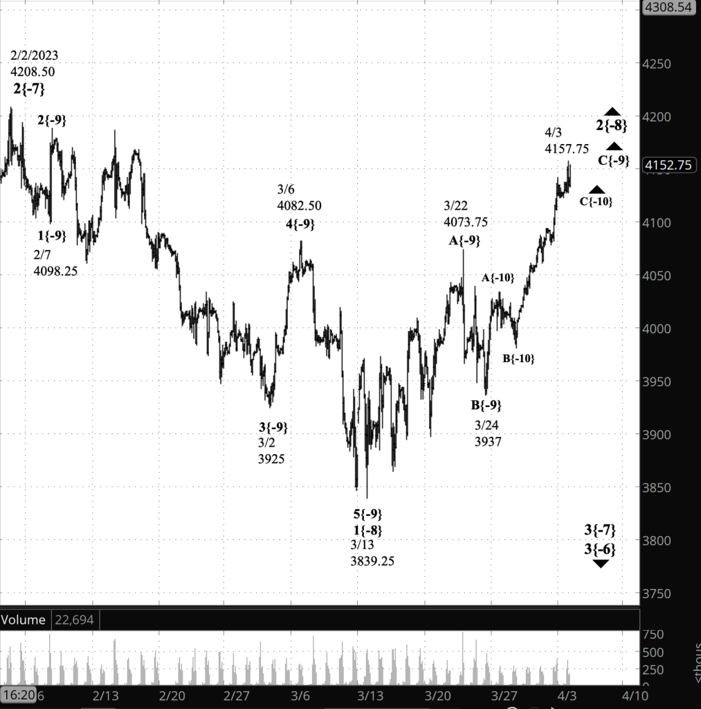 - Within that final wave, wave C{-10} is underway, It will be followed by a decline, wave D{-10}, and then by a wave E{-10}, which will carry the price above the March 31 high, 4142.50.
