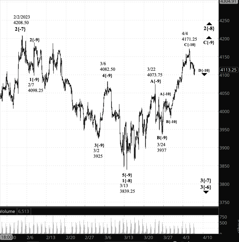 - Within that final wave, declining wave D{-10} is underway, It will be followed by wave E{-10}, which likely will carry the price above the April 4 high, 4171.25.