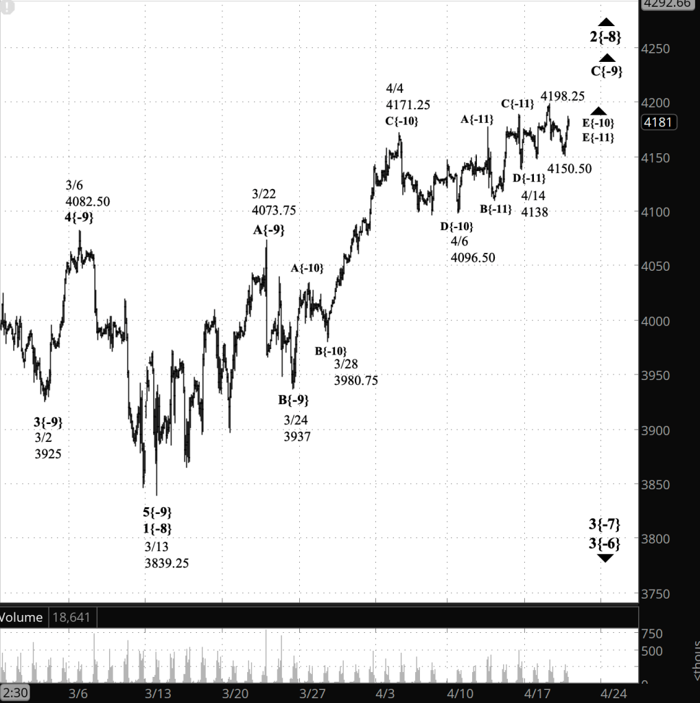 What does it mean? Did the upward correction that began 36 days ago reach its end on April 18, at 4198.25, giving way to the downtrend that Elliott wave analysis told us would follow? Or is there still a final push to the upside ahead before the upward correction is complete?