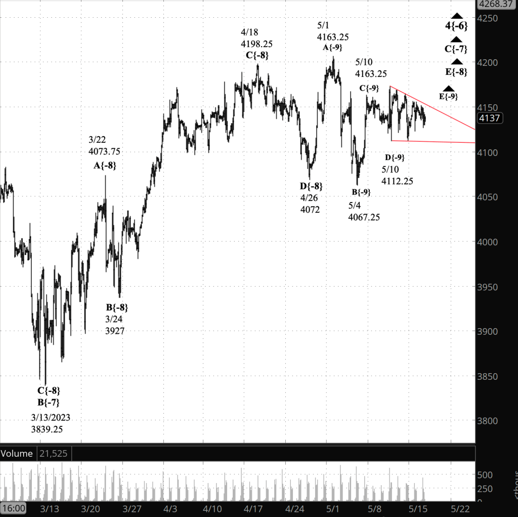 What does it mean? In last Friday’s analysis I mentioned the possibility that a triangle was developing. It’s clear now that such is the case. The triangle form can be characteristic of the final wave of a larger movement. If the triangle analysis proves to be correct, then the upward correction that began on October 13, 2022 is in its last leg down three levels of subwaves. The triangle is nearing the 4th of five subwaves.